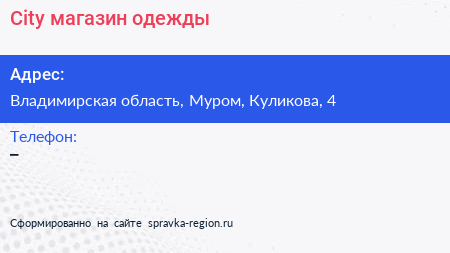 City, магазин одежды по адресу Владимирская область, Муром, Куликова, 4 в дальнейшем Организация, размещена в следующих категориях: