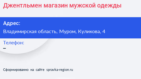 Джентльмен, магазин мужской одежды по адресу Владимирская область, Муром, Куликова, 4 в дальнейшем Организация, размещена в следующих категориях: