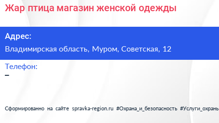Жар птица, магазин женской одежды по адресу Владимирская область, Муром, Советская, 12 в дальнейшем Организация, размещена в следующих категориях: