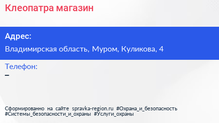 Клеопатра, магазин по адресу Владимирская область, Муром, Куликова, 4 в дальнейшем Организация, размещена в следующих категориях: