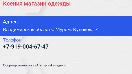 Ксения, магазин одежды по адресу Владимирская область, Муром, Куликова, 4 в дальнейшем Организация, размещена в следующих категориях: