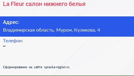 La, Fleur, салон нижнего белья по адресу Владимирская область, Муром, Куликова, 4 в дальнейшем Организация, размещена в следующих категориях: