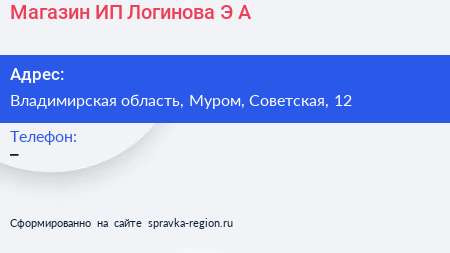 Магазин, ИП Логинова Э.А. по адресу Владимирская область, Муром, Советская, 12 в дальнейшем Организация, размещена в следующих категориях: