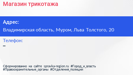 Магазин трикотажа по адресу Владимирская область, Муром, Льва Толстого, 20 в дальнейшем Организация, размещена в следующих категориях:
