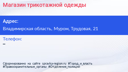 Магазин трикотажной одежды по адресу Владимирская область, Муром, Трудовая, 21 в дальнейшем Организация, размещена в следующих категориях: