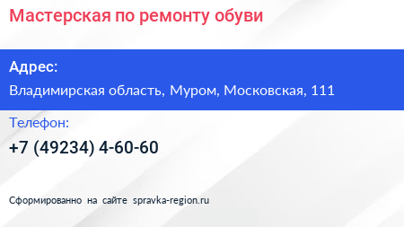 Мастерская по ремонту обуви по адресу Владимирская область, Муром, Московская, 111 в дальнейшем Организация, размещена в следующих категориях: