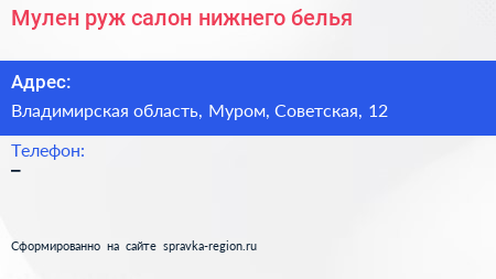 Мулен руж, салон нижнего белья по адресу Владимирская область, Муром, Советская, 12 в дальнейшем Организация, размещена в следующих категориях: