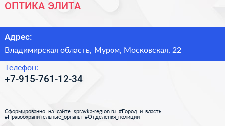 ОПТИКА ЭЛИТА по адресу Владимирская область, Муром, Московская, 22 в дальнейшем Организация, размещена в следующих категориях: