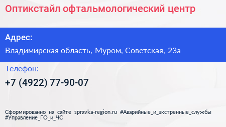 Оптикстайл, офтальмологический центр по адресу Владимирская область, Муром, Советская, 23а в дальнейшем Организация, размещена в следующих категориях: