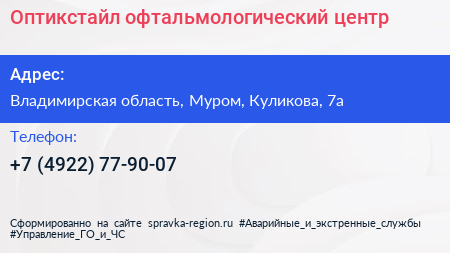Оптикстайл, офтальмологический центр по адресу Владимирская область, Муром, Куликова, 7а в дальнейшем Организация, размещена в следующих категориях: