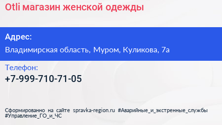 Otli, магазин женской одежды по адресу Владимирская область, Муром, Куликова, 7а в дальнейшем Организация, размещена в следующих категориях: