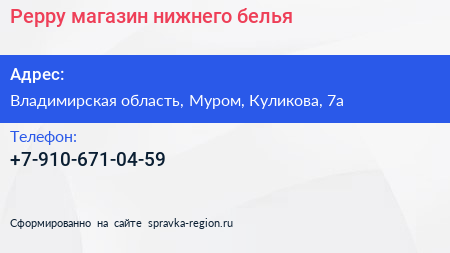 Peppy, магазин нижнего белья по адресу Владимирская область, Муром, Куликова, 7а в дальнейшем Организация, размещена в следующих категориях: