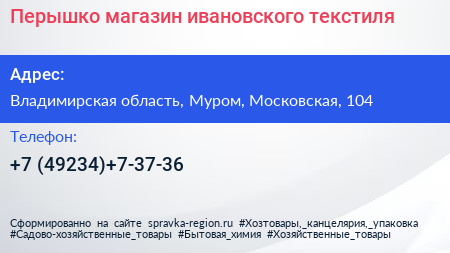 Перышко, магазин ивановского текстиля по адресу Владимирская область, Муром, Московская, 104 в дальнейшем Организация, размещена в следующих категориях: