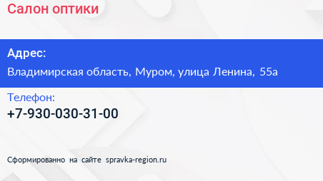 Салон оптики по адресу Владимирская область, Муром, улица Ленина, 55а в дальнейшем Организация, размещена в следующих категориях: