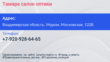 Тамара, салон оптики по адресу Владимирская область, Муром, Московская, 122Б в дальнейшем Организация, размещена в следующих категориях: