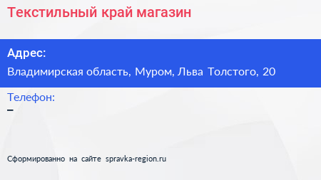 Текстильный край, магазин по адресу Владимирская область, Муром, Льва Толстого, 20 в дальнейшем Организация, размещена в следующих категориях: