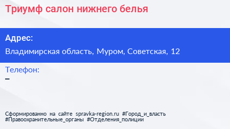 Триумф, салон нижнего белья по адресу Владимирская область, Муром, Советская, 12 в дальнейшем Организация, размещена в следующих категориях: