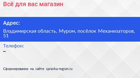 Всё для вас, магазин по адресу Владимирская область, Муром, посёлок Механизаторов, 51 в дальнейшем Организация, размещена в следующих категориях: