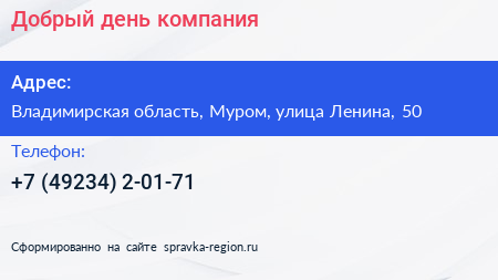 Добрый день, компания по адресу Владимирская область, Муром, улица Ленина, 50 в дальнейшем Организация, размещена в следующих категориях: