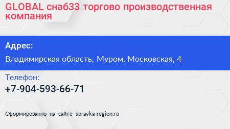 GLOBAL-снаб33, торгово-производственная компания по адресу Владимирская область, Муром, Московская, 4 в дальнейшем Организация, размещена в следующих категориях: