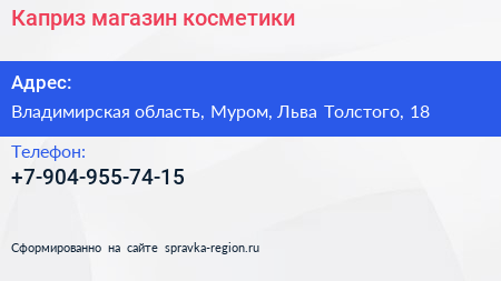 Каприз, магазин косметики по адресу Владимирская область, Муром, Льва Толстого, 18 в дальнейшем Организация, размещена в следующих категориях: