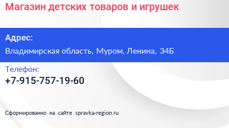 Магазин детских товаров и игрушек по адресу Владимирская область, Муром, Ленина, 34Б в дальнейшем Организация, размещена в следующих категориях: