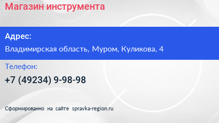 Магазин инструмента по адресу Владимирская область, Муром, Куликова, 4 в дальнейшем Организация, размещена в следующих категориях: