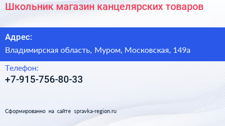 Школьник, магазин канцелярских товаров по адресу Владимирская область, Муром, Московская, 149а в дальнейшем Организация, размещена в следующих категориях: