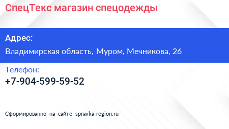СпецТекс, магазин спецодежды по адресу Владимирская область, Муром, Мечникова, 26 в дальнейшем Организация, размещена в следующих категориях: