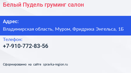 Белый Пудель, груминг-салон по адресу Владимирская область, Муром, Фридриха Энгельса, 1Б в дальнейшем Организация, размещена в следующих категориях: