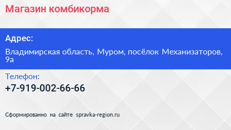 Магазин комбикорма по адресу Владимирская область, Муром, посёлок Механизаторов, 9а в дальнейшем Организация, размещена в следующих категориях:
