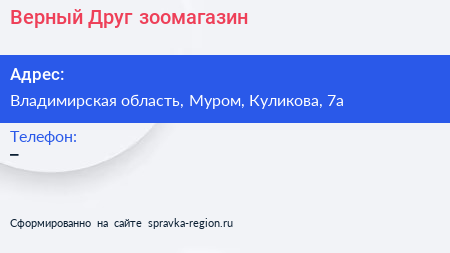 Верный Друг, зоомагазин по адресу Владимирская область, Муром, Куликова, 7а в дальнейшем Организация, размещена в следующих категориях: