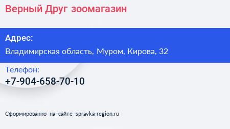 Верный Друг, зоомагазин по адресу Владимирская область, Муром, Кирова, 32 в дальнейшем Организация, размещена в следующих категориях: