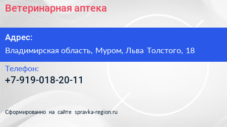 Ветеринарная аптека по адресу Владимирская область, Муром, Льва Толстого, 18 в дальнейшем Организация, размещена в следующих категориях: