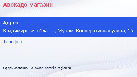 Авокадо, магазин по адресу Владимирская область, Муром, Кооперативная улица, 15 в дальнейшем Организация, размещена в следующих категориях: