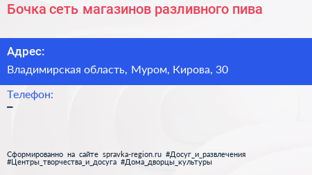 Бочка, сеть магазинов разливного пива по адресу Владимирская область, Муром, Кирова, 30 в дальнейшем Организация, размещена в следующих категориях: