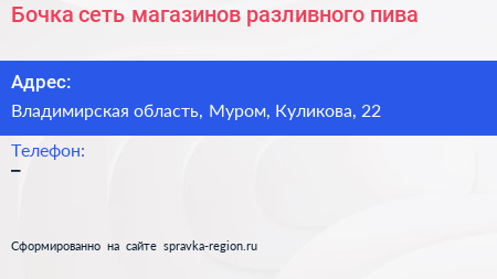 Бочка, сеть магазинов разливного пива по адресу Владимирская область, Муром, Куликова, 22 в дальнейшем Организация, размещена в следующих категориях: