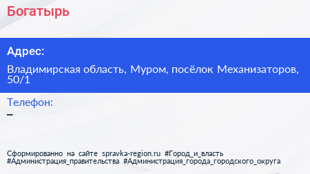 Богатырь+ по адресу Владимирская область, Муром, посёлок Механизаторов, 50/1 в дальнейшем Организация, размещена в следующих категориях: