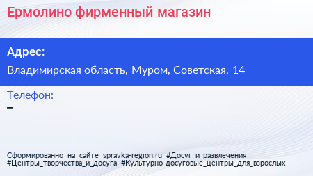 Ермолино, фирменный магазин по адресу Владимирская область, Муром, Советская, 14 в дальнейшем Организация, размещена в следующих категориях: