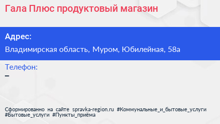 Гала-Плюс, продуктовый магазин по адресу Владимирская область, Муром, Юбилейная, 58а в дальнейшем Организация, размещена в следующих категориях: