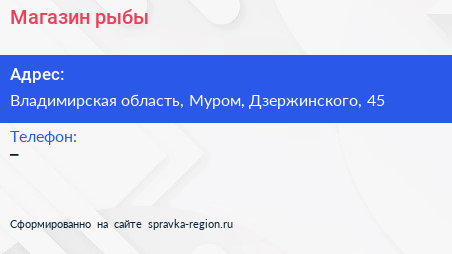 Магазин рыбы по адресу Владимирская область, Муром, Дзержинского, 45 в дальнейшем Организация, размещена в следующих категориях: