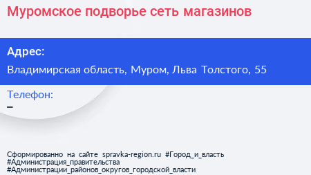 Муромское подворье, сеть магазинов по адресу Владимирская область, Муром, Льва Толстого, 55 в дальнейшем Организация, размещена в следующих категориях: