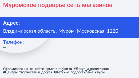 Муромское подворье, сеть магазинов по адресу Владимирская область, Муром, Московская, 122Б в дальнейшем Организация, размещена в следующих категориях: