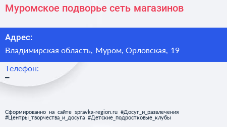 Муромское подворье, сеть магазинов по адресу Владимирская область, Муром, Орловская, 19 в дальнейшем Организация, размещена в следующих категориях: