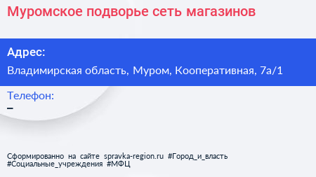 Муромское подворье, сеть магазинов по адресу Владимирская область, Муром, Кооперативная, 7а/1 в дальнейшем Организация, размещена в следующих категориях: