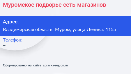 Муромское подворье, сеть магазинов по адресу Владимирская область, Муром, улица Ленина, 115а в дальнейшем Организация, размещена в следующих категориях: