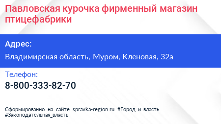 Павловская курочка, фирменный магазин птицефабрики по адресу Владимирская область, Муром, Кленовая, 32а в дальнейшем Организация, размещена в следующих категориях: