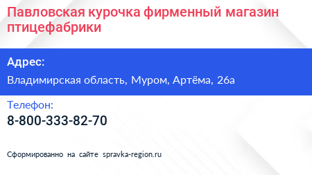 Павловская курочка, фирменный магазин птицефабрики по адресу Владимирская область, Муром, Артёма, 26а в дальнейшем Организация, размещена в следующих категориях: