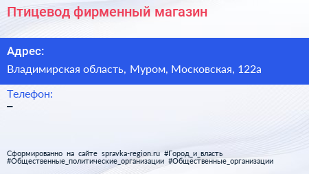 Птицевод, фирменный магазин по адресу Владимирская область, Муром, Московская, 122а в дальнейшем Организация, размещена в следующих категориях: