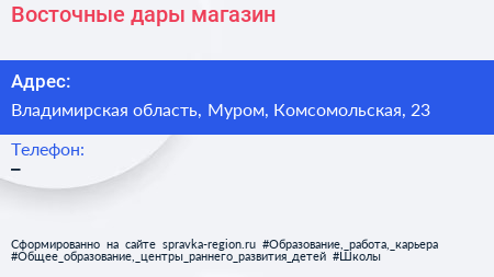 Восточные дары, магазин по адресу Владимирская область, Муром, Комсомольская, 23 в дальнейшем Организация, размещена в следующих категориях: